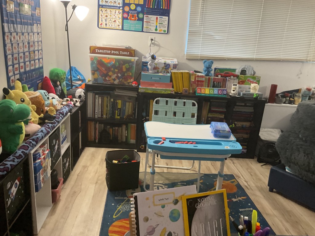 Okay, back to the topic at hand, the first thing I did once I decided to homeschool is I created a space for my kiddo to learn. We do not have a lot of space; we are in a small one-bedroom apartment after staying in a women and children’s center in 2024, when I left a domestic abuse relationship. We are saving up for a bigger space, but I am highly grateful for the home we have currently.
