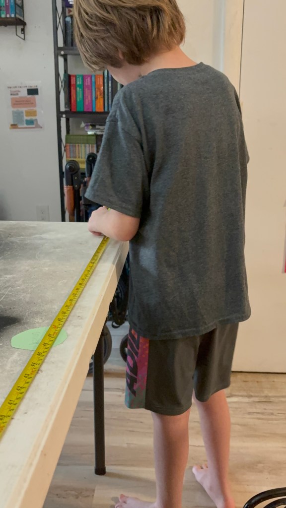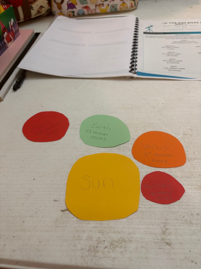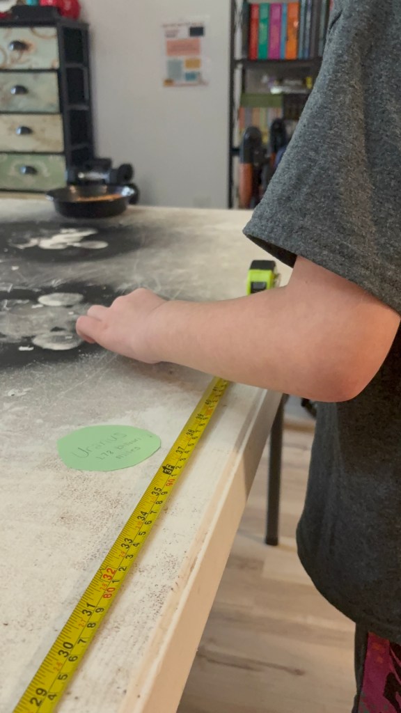Killian really enjoyed this experiment and learned how to use a tape measure to measure the distance, inches and feet, how to scale something massive into something smaller, and the distance of the planets from the sun.