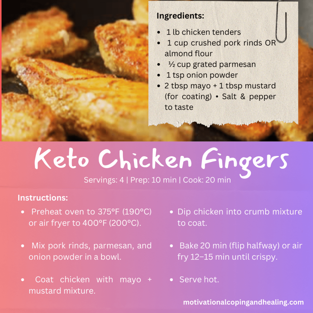 Chicken fingers are often my go to for lunch if driving through a fast-food restaurant. So, I wanted to figure out how to make them keto-friendly style and share it with you guys. It’s quite simple and doesn’t need a lot of ingredients to make.